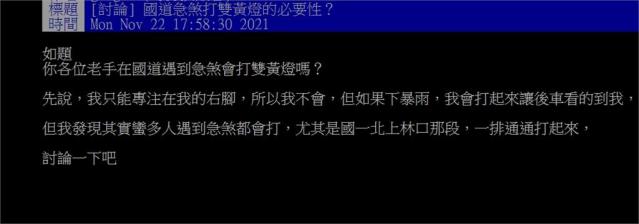 ▼原po在PTT上發文說:「各位老手在國道遇到急煞會打雙黃燈嗎?先說,我只能專注在我的右腳,所以我不會,但如果下暴雨,我會打起來讓後車看的到我,但我發現其實蠻多人遇到急煞都會打,尤其是國一北上林口那段,一排通通打起來。」他想知道,大家是不是在國道上煞車都會打雙黃燈?