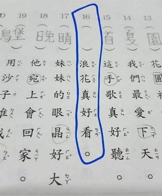 該題目是國語考卷的改錯題,其中第16題未填寫答案,題目只有5個字:「浪花真好看。」家長左思右想還是不知道哪個字有問題。該國語考題被轉發至臉書社團《爆料公社》引起熱議,九千多位網友關注點贊,留言討論甚至超過3500條。