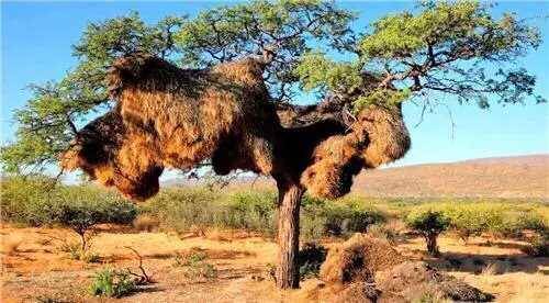 在南非和納米比的亞半干旱平原上,人們發現了一個與眾不同的鳥巢,它的主人是500只擬廈鳥,也就是群居織巢鳥。
