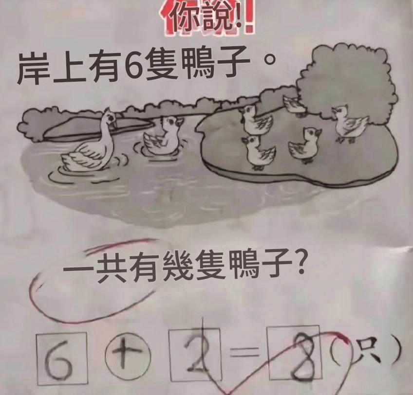 一位媽媽最近在社交媒體上分享了自己的尷尬經歷:她的兒子做了一道題:岸上有6隻鴨子,水中有兩隻鴨子,那麼總共有幾隻鴨子?孩子寫下「6+2=8」,結果被老師打了個大紅叉。