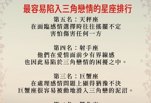 第一名:摩羯座摩羯座以其堅韌不拔和寫實主義聞名,然而在感情世界裡,他們時常成為三角戀情的主角。女性摩羯座往往傾心於那種事業有成、穩重而又富有情趣的男性,而這類人往往已有家室;至於男性摩羯,則可能被風塵味濃厚、人際關係複雜的女性所吸引,這種複雜性讓他們容易捲入多角關係。