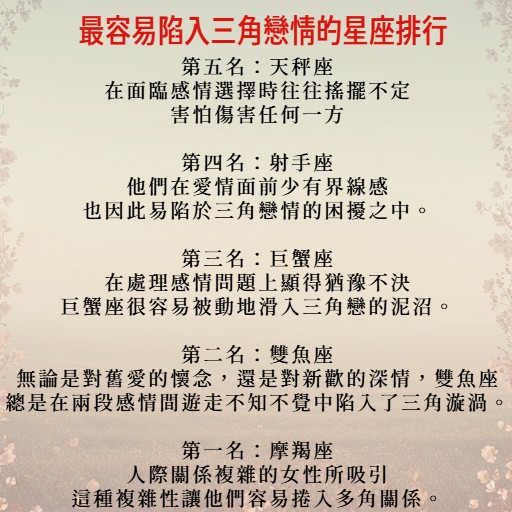 想像這樣一個場景:月光下的摩羯座女子,她那雙深邃的眼睛凝視著穩重且充滿魅力的成功男士,儘管對方已有所屬,但她依然無法抗拒那份成熟與穩重所帶來的引力。同時,在另一個角落,射手座男子正懷抱著對自由愛情的執著,毫無保留地投入一段明知充滿挑戰的感情糾葛中。這樣的故事並非虛構,而是反映了某些星座在面對感情抉擇時難以迴避的困境──三角戀。