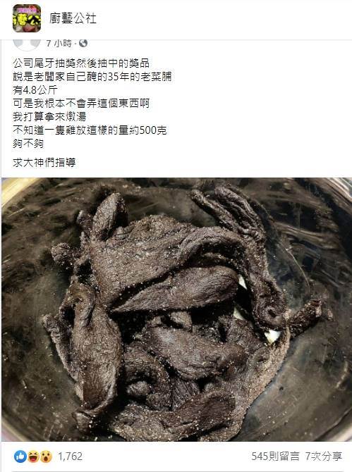 這份三獎的重量高達4.8公斤,且散發著濃重的味道。網友好奇問老闆這是什麼,才得知這是老闆家自醃了35年的老菜脯。雖然現場有人覺得不錯,但該網友坦言自己根本不知道如何處理這份禮物,笑問大家:「不知道一隻雞放這樣的量,約500克夠不夠?」引起眾多網友熱烈討論。