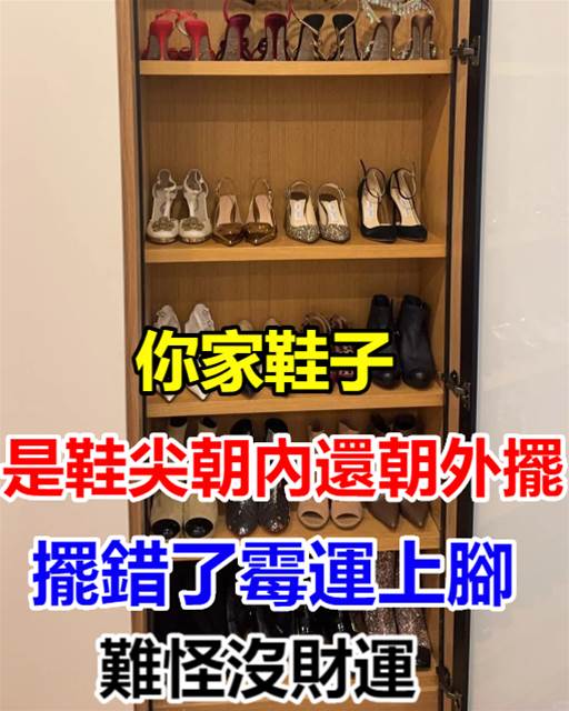 鞋子跟隨著它的主人整天四處走,上面沾染了太多的「金、木、水、火、土」五行之氣,氣場比較雜亂,因此鞋子一定不能亂放,否則便會影響主人的運勢,例如健康、財運等都會有不利影響。因此回到家一定要將外出穿的鞋子換下,放到鞋櫃裏,而且要鞋尖向內。