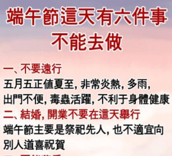 農曆五月五日又被稱為「惡月惡日」,在這天不宜舉辦任何婚喪喜慶或開工開業,以免沾染穢氣、招致厄運,除了端午節,訂婚也應盡量避免三、七、九這三個月,因為這三個月分別含有清明、盂蘭、重公等「鬼節」,新人們請筆記起來!