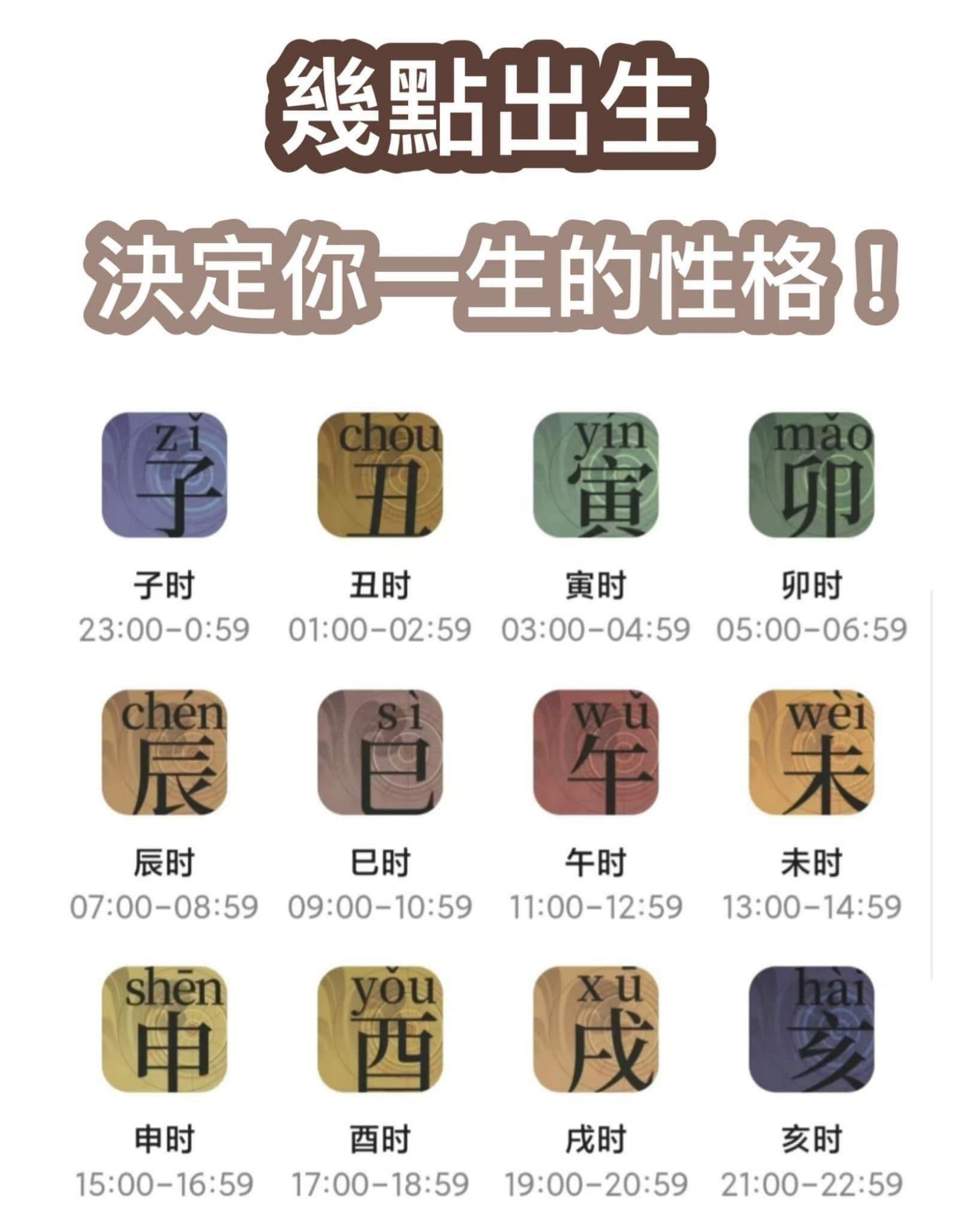 | 寅時(03:00-04:59) | 有衝勁、有理想,獨立,富冒險精神。 |
