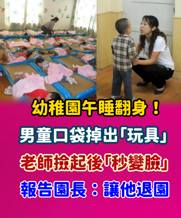 某天中午,孩子們準備午休,老師一如往常協助孩子們換上午睡服。這時,她注意到其中一位小男孩的口袋鼓鼓的,乍看之下以為是孩子偷偷帶來的玩具,也就沒有多想。但沒想到,孩子在床上翻身時,那個「玩具」從口袋裡掉了出來。