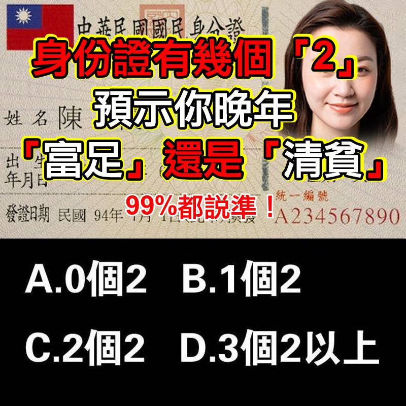 每個人的身份證都具有唯一性,是一種身份的象徵,代表了你個人,身份證號碼之中暗藏著出生地域及生日資訊,自然也會包括很多命運密碼。你的身份證號碼中有幾個2,測出你的性格和命運!註:心理測試只是提供一定的參照,答案僅供參考,三分天註定,七分靠自己,祝大家開心幸福。