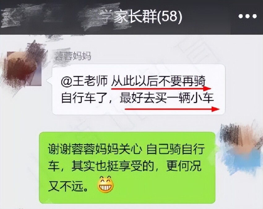根據報導,一位媽媽直接在學生家長群裡標記王老師:「從此以後不要再騎自行車了,最好去買一輛小車。」王老師非常客氣感謝家長關心,並解釋家住附近,騎腳踏車也是一種享受。