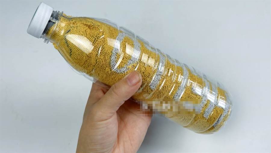 接下來,我們把剛剛改造的塑料瓶掰開,再將毛巾放在里面並擰緊瓶蓋就可以了。把它放在包包或行李箱里,既整齊還不占空間,哪怕毛巾是濕的也沒有關係。