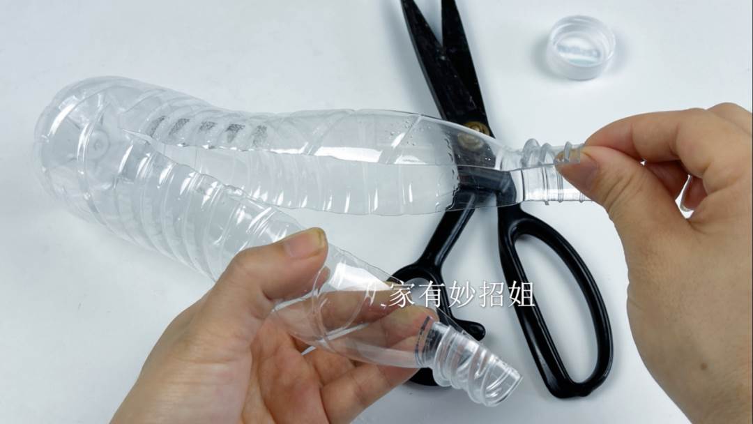 接著我們把瓶蓋擰開放一邊,再用剪刀從瓶口處往下剪一條直線,不要剪到底了,大概剪到瓶子的三分之二的位置。剪好,我們再到這條線的對立面,也剪一道同樣的口子。全部剪好我們就得到了一個能撐開,但又沒有完全斷裂的塑料瓶。接下來我們就來看看這樣一個瓶子它有哪些作用吧~