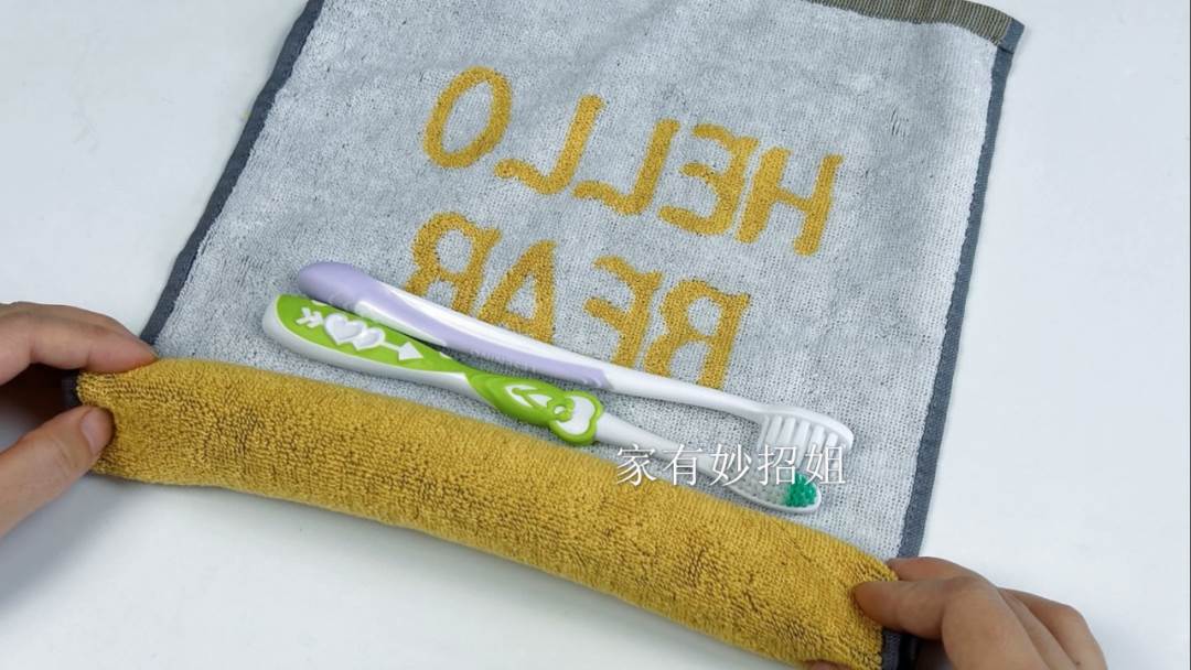 很多朋友不喜歡用酒店里提供的日用品,每次出遠門就都要從家里帶,比如牙刷、毛巾之類的。這個時候,我們就可以先拿條毛巾平鋪在桌面上,然后把牙刷放在毛巾上,接著再將毛巾卷起來,盡量給它捲的緊實一點,這樣毛巾就變成了一個圓筒的形狀。