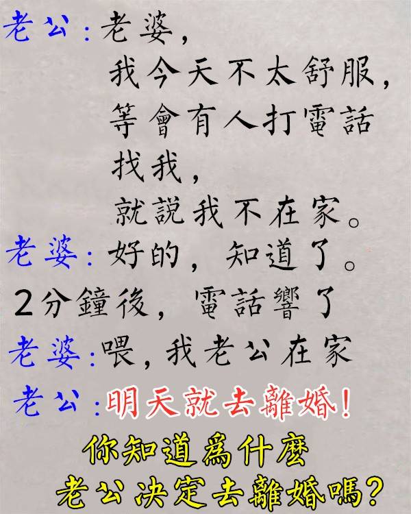 答 : 老婆接到的是自己的電話不是別人打給她老公的