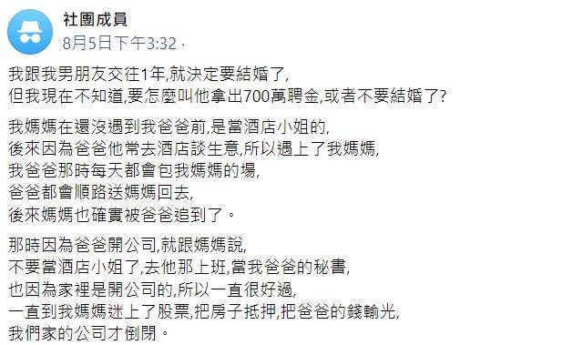 由於原PO爸爸不打算收聘金,因此男友也沒有給,於是她的母親希望她能夠開口,要求男友支付700萬的聘金,用來協助償還母親的債務,原PO聽完後認為700萬對男友家境來說只是一筆小錢,加上一片孝心希望母親的日子能夠好過一點,于是主動告知男友此事。