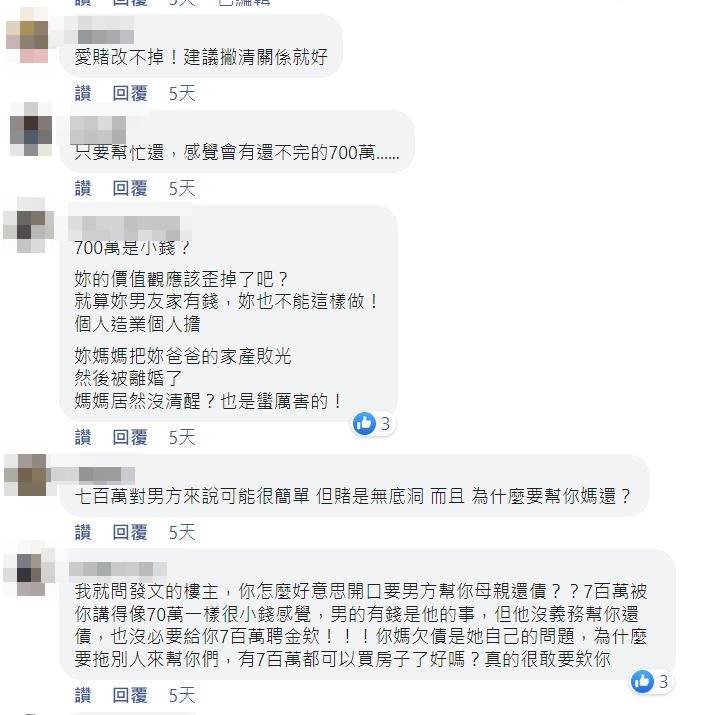 沒想到消息一出後,網友留言一面倒,全都不支持原PO,紛紛在底下留言指責:「700萬是小錢嗎?妳自己都沒有7百萬吧!」、「媽媽這次開口要700萬,往後只會要更多!」、「就算對男方而言是小事,但為何要他來承擔?」、「媽媽的惡習改不掉,與其幫忙還不如撇清關係!」、「如果覺得是男友欠你的,婚真的別結了,去好好孝順媽媽,自己幫她還錢吧!」