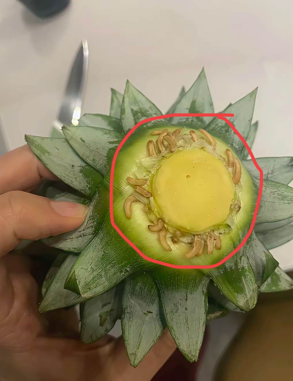 她切開鳳梨,準備享受這份酸甜多汁的美味,卻沒想到鳳梨芯邊上那一圈,竟然是密密麻麻的根須。這讓女士瞬間毛骨悚然,整個人都驚呆了。