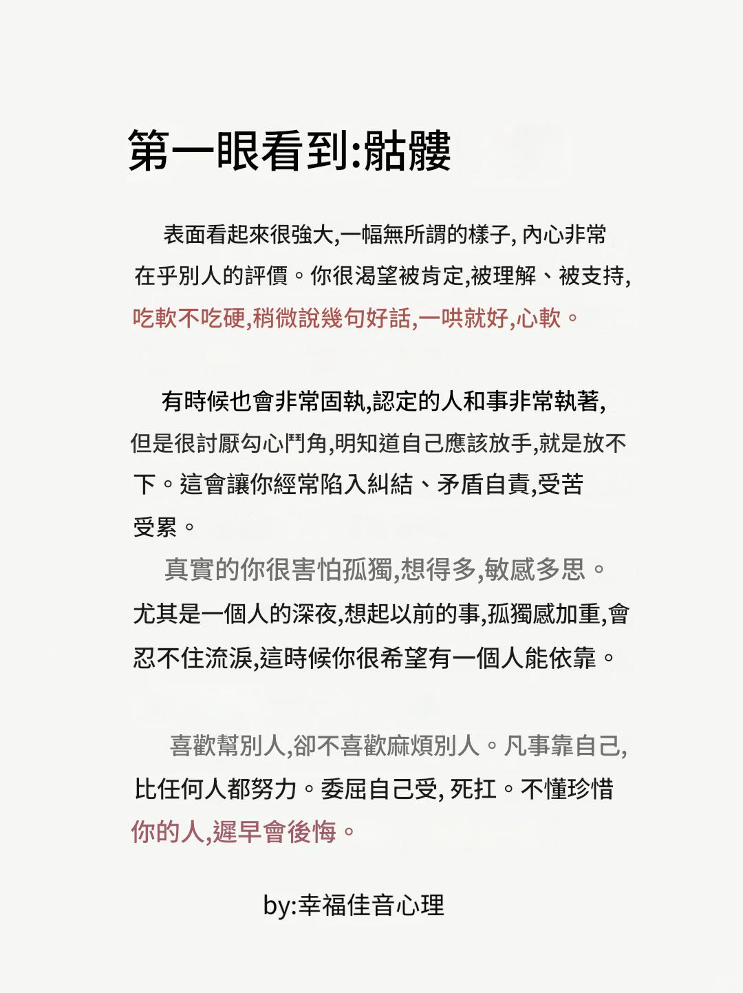 但你的缺點就是有點愛面子,對於別人批評總是會往心裡去,甚至不惜挺身而出為自己辯駁,雖然嘴巴上不會示弱,但是其實你內心會默默自省並時常因此而受傷。