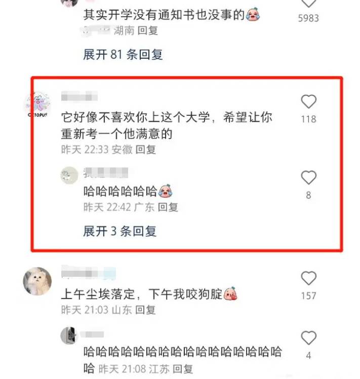 像是有位女同學,早上才在朋友圈開心分享自己考上江南大學的喜訊,連發三張錄取通知書的照片,每張都不同角度,看得出來真的超開心。