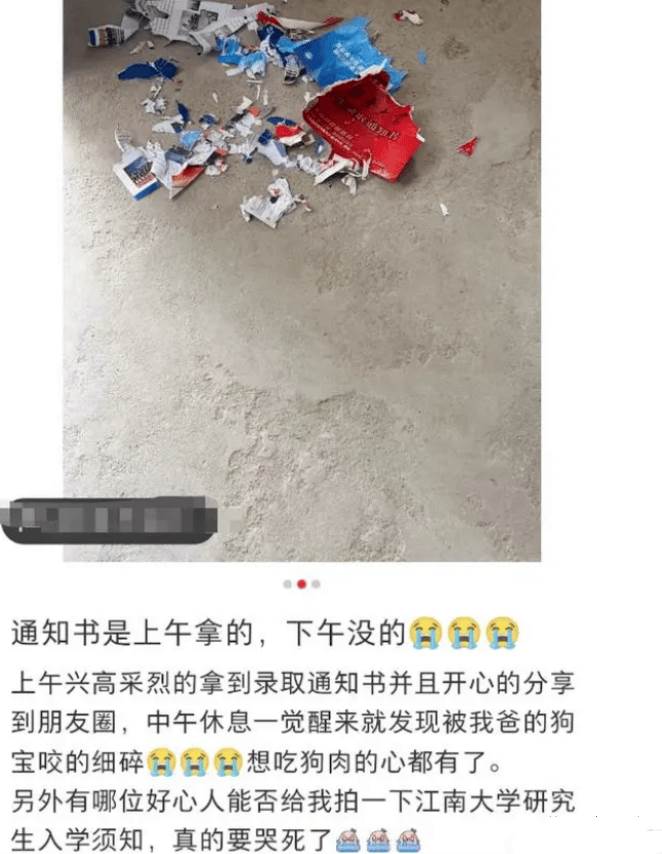 結果沒想到,睡個午覺起來,她竟發現錄取通知書已經被咬爛成碎片,而「兇手」竟是家裡爸爸養的狗……