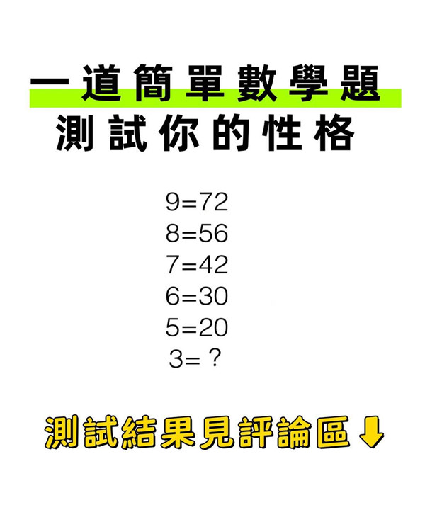 有人一看就覺得規律很明顯:9乘8得72,8乘7得56,7乘6得42,6乘5得 30,5乘4得20,那3就該乘2,得6,選 A~~~這是典型的邏輯演算法,一步步推導,特別嚴謹