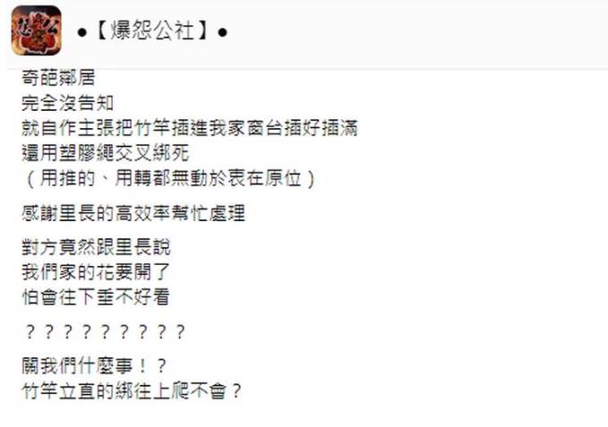 網友在臉書社團《爆怨公社》貼出誇張照片,住在對面的鄰居未經同意就拿竹竿架在兩戶陽台之間,竿子硬生生穿過原PO陽台的鐵架,「還用塑膠繩交叉綁死,用推的、用轉的都無動于衷在原位」。