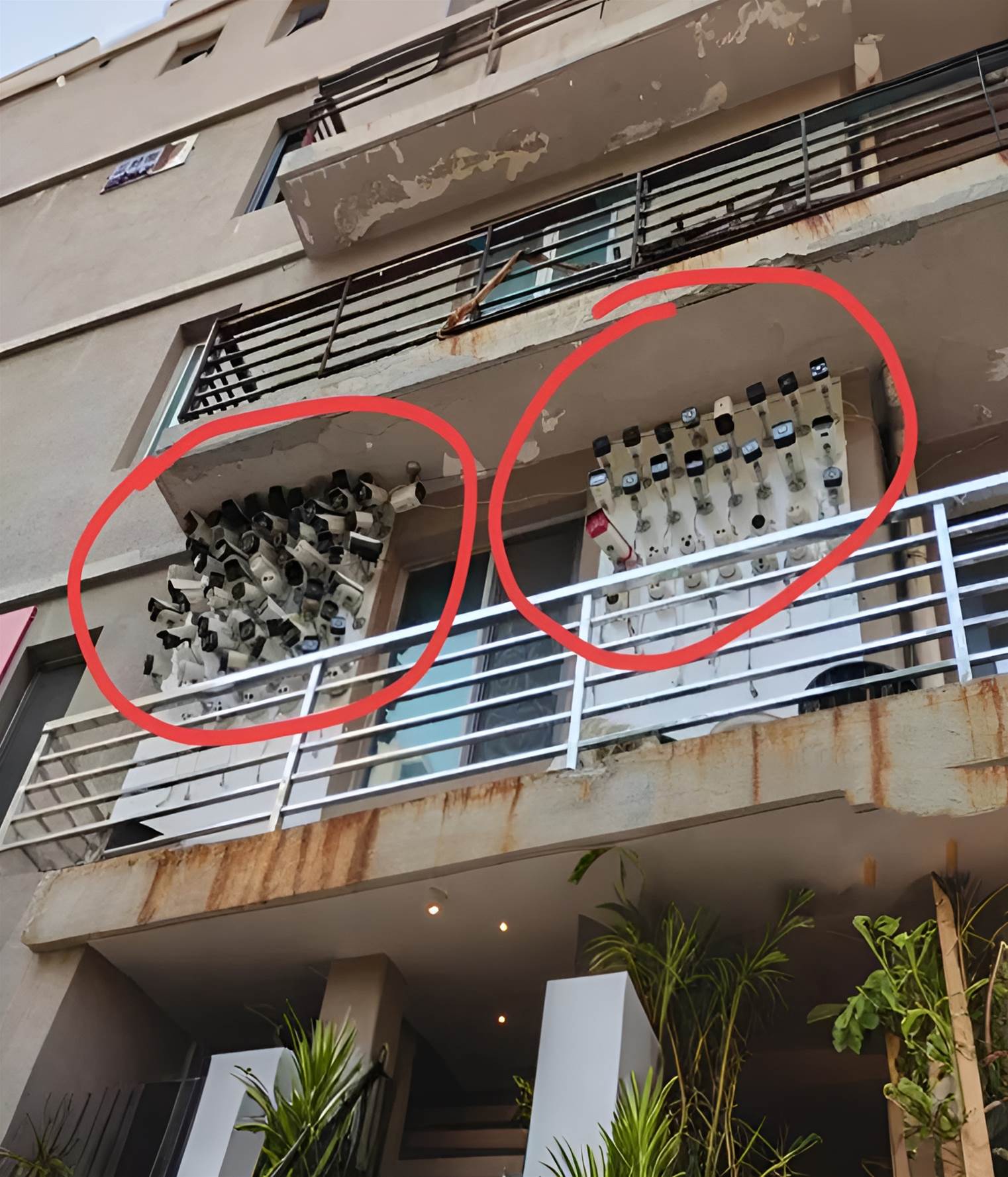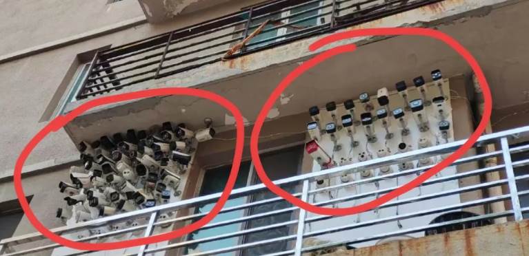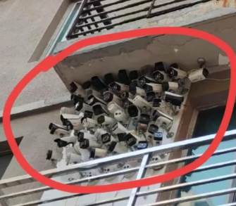 黑的白的、球型的、槍型的、還有帶探照燈、可以360度旋轉的……整個看起來就像一隻「鋼鐵壁虎」扒在牆上,乍看真的會以為走錯棚,誤闖什麼反恐指揮中心!拍照的網友都傻眼:「這是在防誰啊?也太誇張了吧!」畫面中那些金屬設備在太陽下反著冷光,隔著螢幕都能感覺到壓迫感。