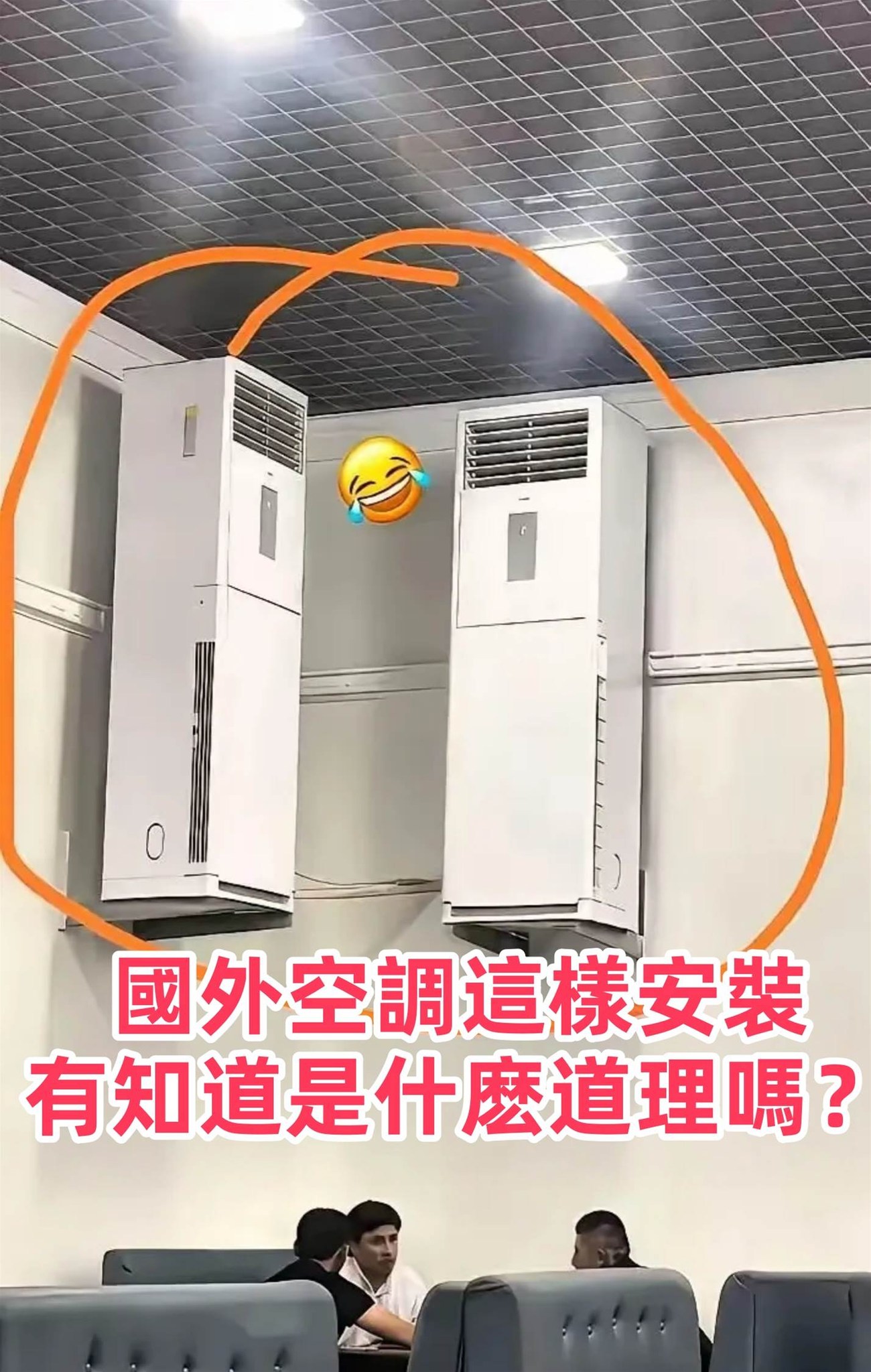 公共空間的冷氣剛需: 下方有座椅,像教室/小會場/活動中心。需要為大面積快速制冷,壁掛小空調不夠力,中央系統成本/空間又不允許——立式柜機成了性能性價比之選,哪怕要用「非常規姿勢」安裝。