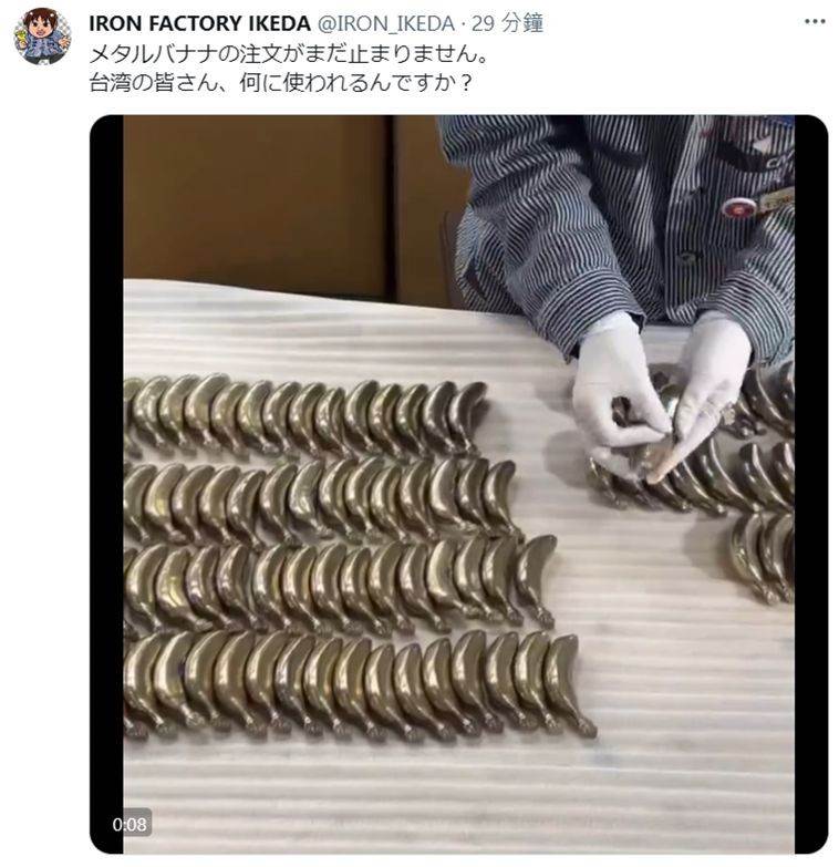 「IRON FACTORY IKEDA」官方推特分享鋼鐵香蕉加速趕工的製程畫面,也於貼文中說道:「鋼鐵香蕉的訂單仍然持續增加中,台灣的朋友們,將用來做什麼、用於何處呢?」