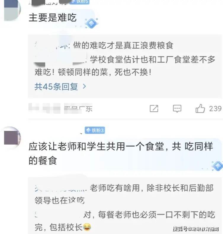 網友們也在聲討:「校長敢吃嗎?老師和其他教職工敢吃嗎?」、「如果學校採取師生同一食堂就餐,學校食堂還敢把飯菜做成這副難以下咽的樣子?」話題討論到白熱化階段,答案已經招人若揭,多年來吐槽學校食堂難吃的學生和家長不在少數,但都被一句「不吃完就是浪費糧食」的聖母發言給懟回去了。