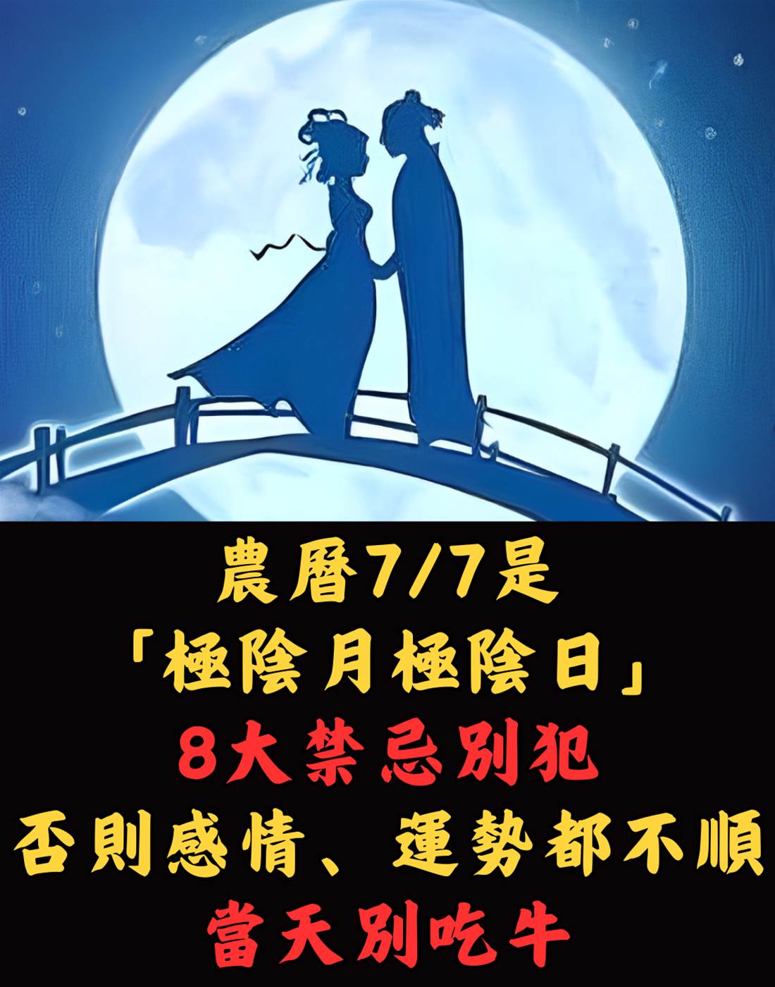 本週五正值 七夕,也是農曆 7月7日,這一天同時落在 極陰月極陰日,在命理上屬於「陰氣最重」的一天。如果不注意一些禁忌,不只感情容易起波折,財運和整體運勢也可能受到影響。