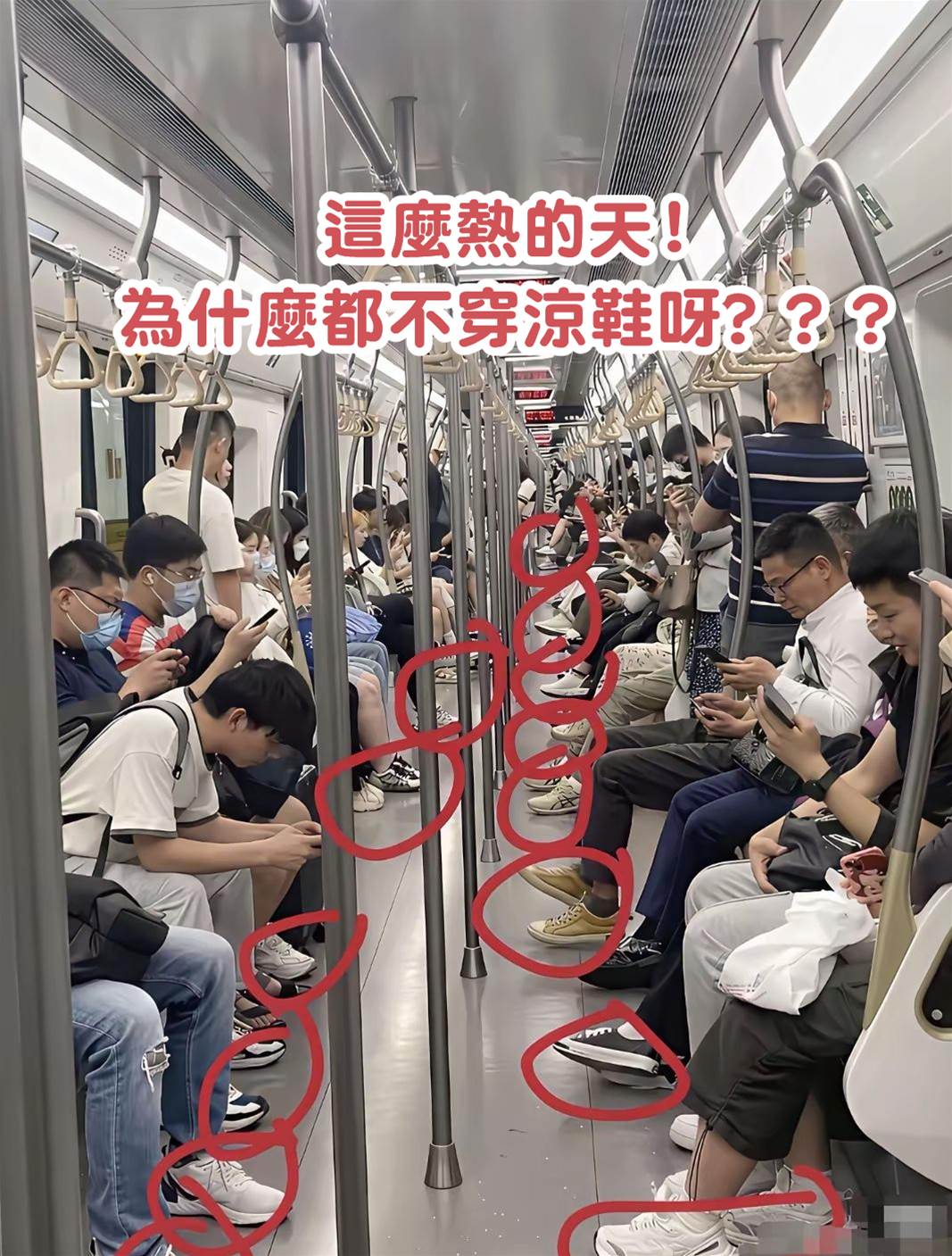 看完忍不住笑出聲,因為網友說的都太中肯了。回想捷運上的鞋履版圖,清一色都是球鞋、樂福鞋、皮鞋,要找涼鞋真的稀有。