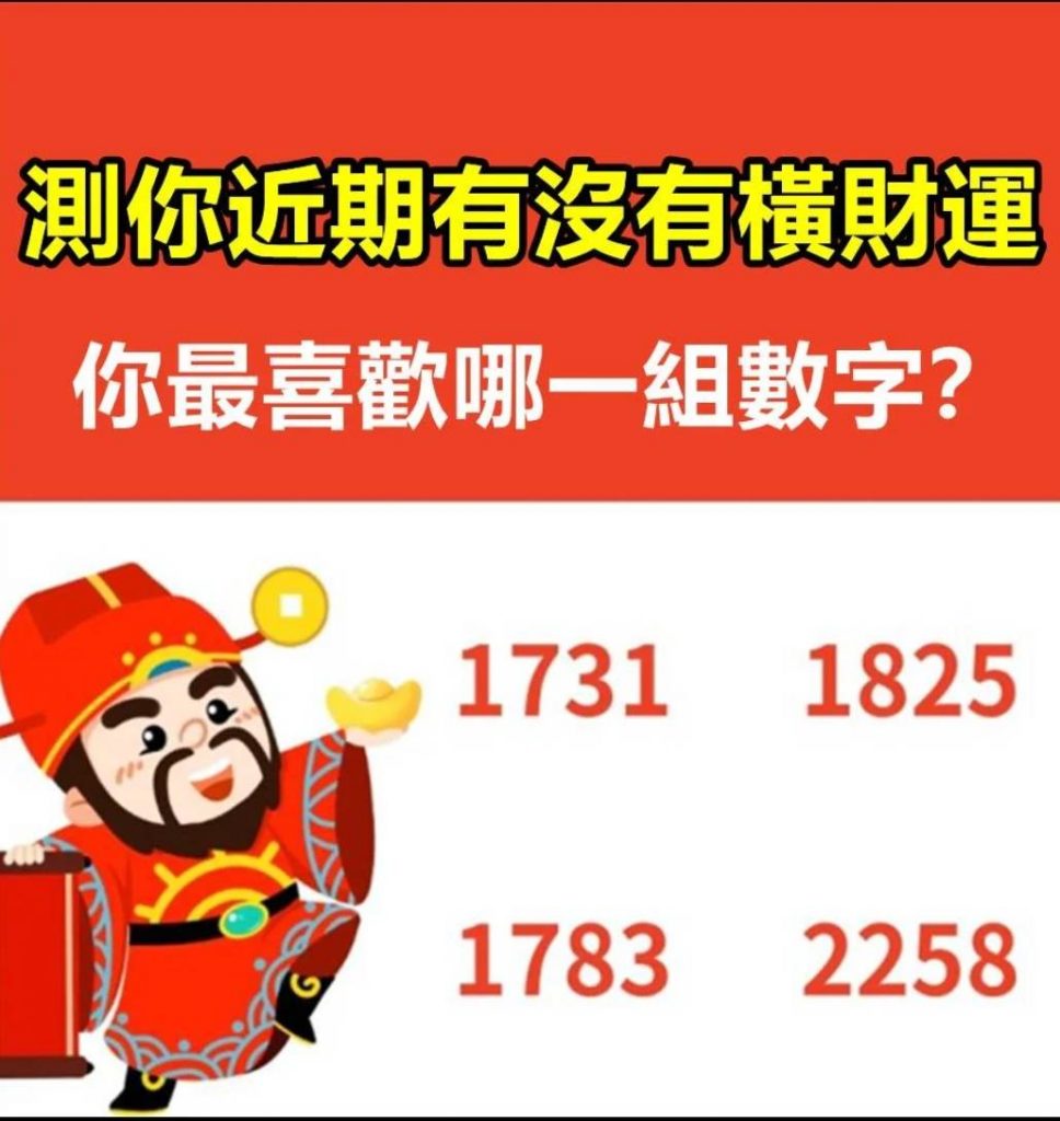 選1783的你:膽大心細,善於抓住發財機遇,勇於行動。 近期你的橫財運非常好,你敢於冒險,並且善於觀察和分析市場趨勢,因此能夠捕捉到一些其他人可能忽略的發財機會。 然而,要過著更富裕的生活,僅靠橫財是不夠的。 你需要將更多精力放在正常的財務收入上,擴大收入範圍才是上策。