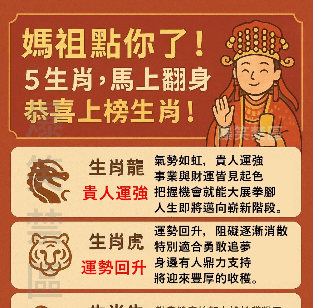 媽祖,台灣重要的信仰神祇,以其慈悲和顯靈聞名。據說,當媽祖「點名」時,被選中的人將迎來運勢的大幅轉變,特別是在財運方面。以下這五個生肖,恭喜您,已經被媽祖的靈光眷顧,即將迎來財運的爆發期,人生即將翻轉!