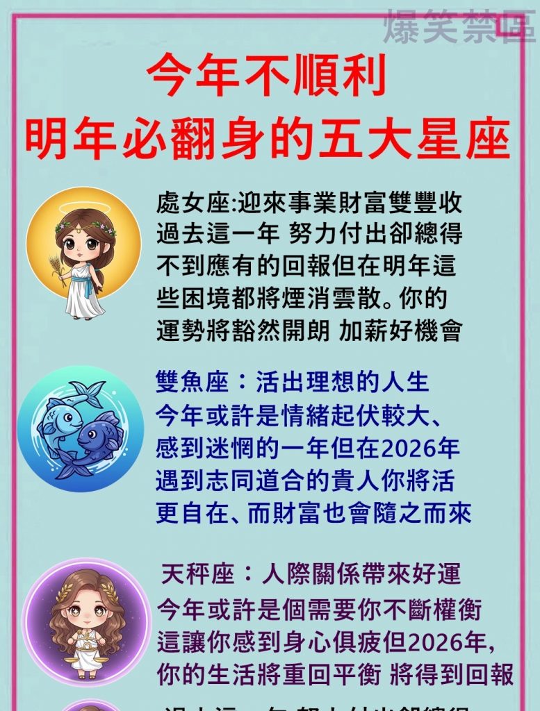 是不是覺得今年過得特別辛苦?無論是事業上的瓶頸、感情中的摩擦,還是總有意外狀況來攪局,讓你感到心累又無力?別擔心,宇宙已經接收到你的訊息,準備在2026年為你打開一扇全新的大門!過去所有的不順遂,都將成為你未來成功的養分。特別是這五個星座,他們將告別所有的低潮,迎來一個充滿希望、財富和機會的黃金年!