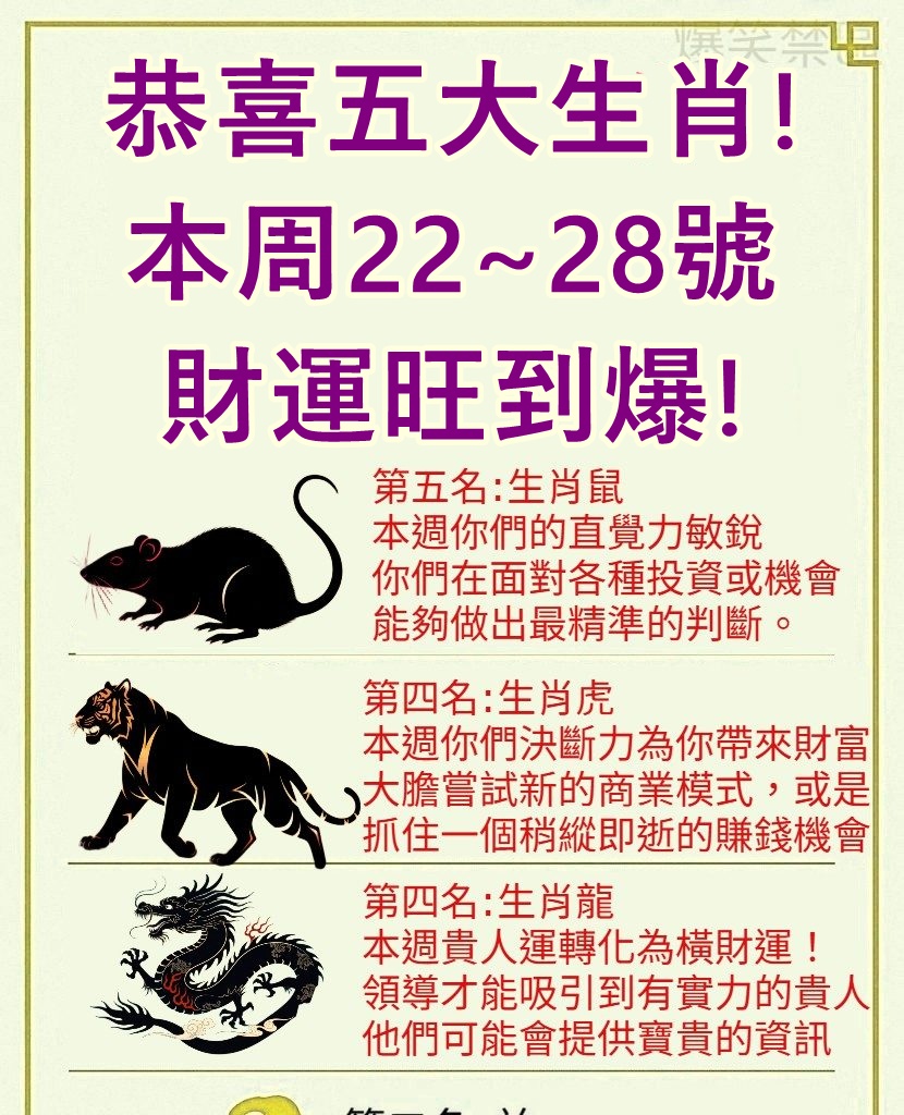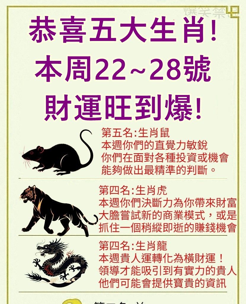 本週橫財運爆棚的五大生肖: