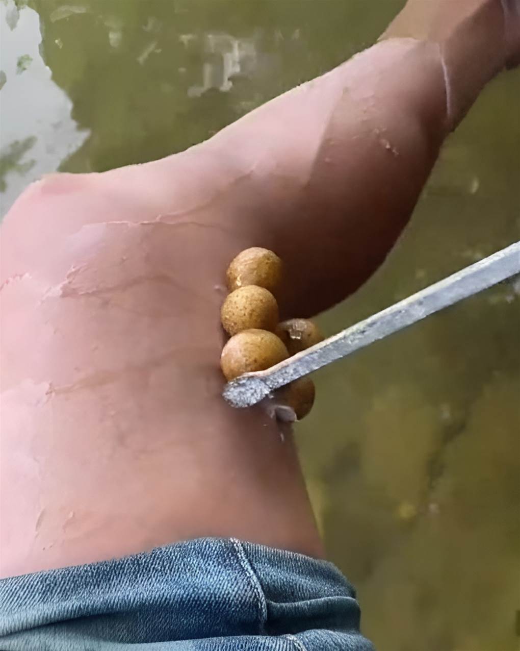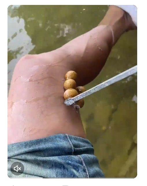 正玩得開心時,突然覺得小腿一陣癢,低頭一看,嚇一跳——腿上竟黏著幾個棕色的小圓球!乍看之下,還以為是什麼「水蛭蛋」。我下意識就想伸手去拔,結果旁邊一位大哥立刻出聲制止:「千萬別動!這是在害自己!」