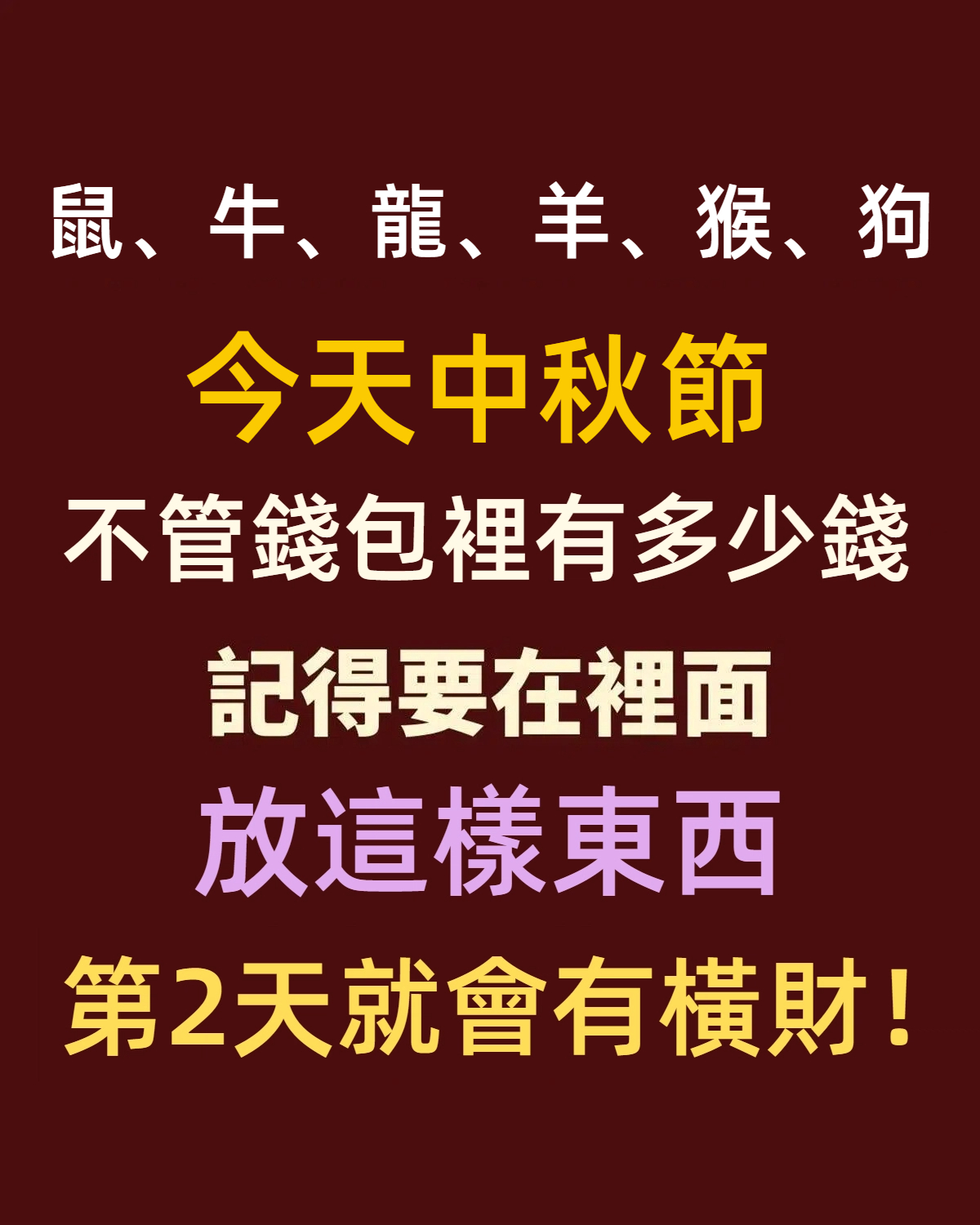 中秋節不只是賞月、團圓的日子,對「鼠、牛、龍、羊、猴、狗」這六個生肖來說,更是一年中少見的聚財轉運日!只要在今晚睡前、月圓最亮的時候,動一個小小的「錢包開運手腳」,明天一早就可能喜迎意外之財!