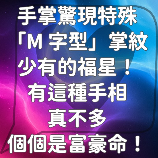 趕快攤開您的手掌,仔細檢查是否有這條罕見的「M 字型」掌紋。如果您的 M 字紋紋路清晰、沒有雜紋干擾,那麼恭喜您,您就是那少數被命運眷顧的幸運兒!請相信自己的能力與福氣,大膽去創造屬於您的財富傳奇!