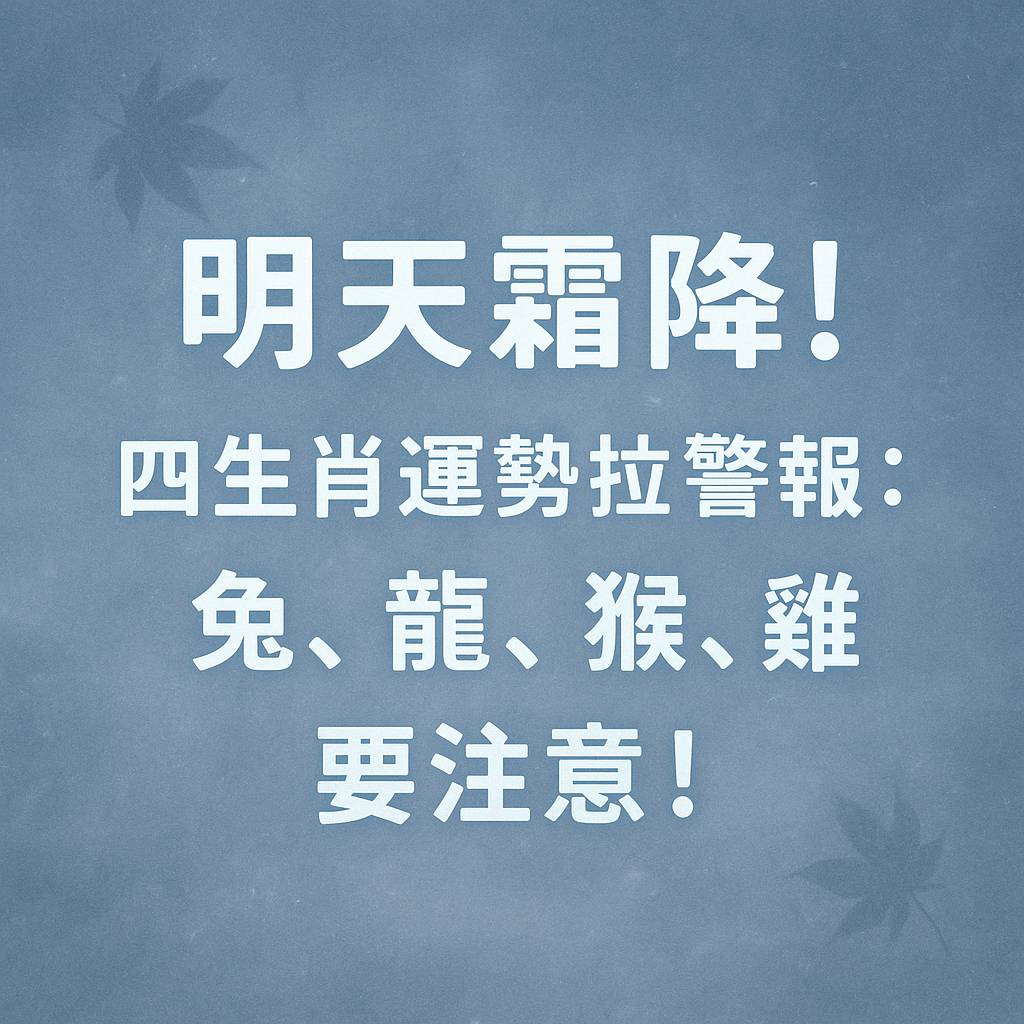 國曆10月23日(星期四)將迎來秋季的最後一個節氣——霜降。霜降意味著天氣將更加寒冷乾燥,晝夜溫差拉大,萬物開始凋零,象徵著秋天結束,冬天即將到來。在這個「氣轉折點」,有四個生肖的運勢容易受到波動影響,需要特別提高警覺、謹慎應對。