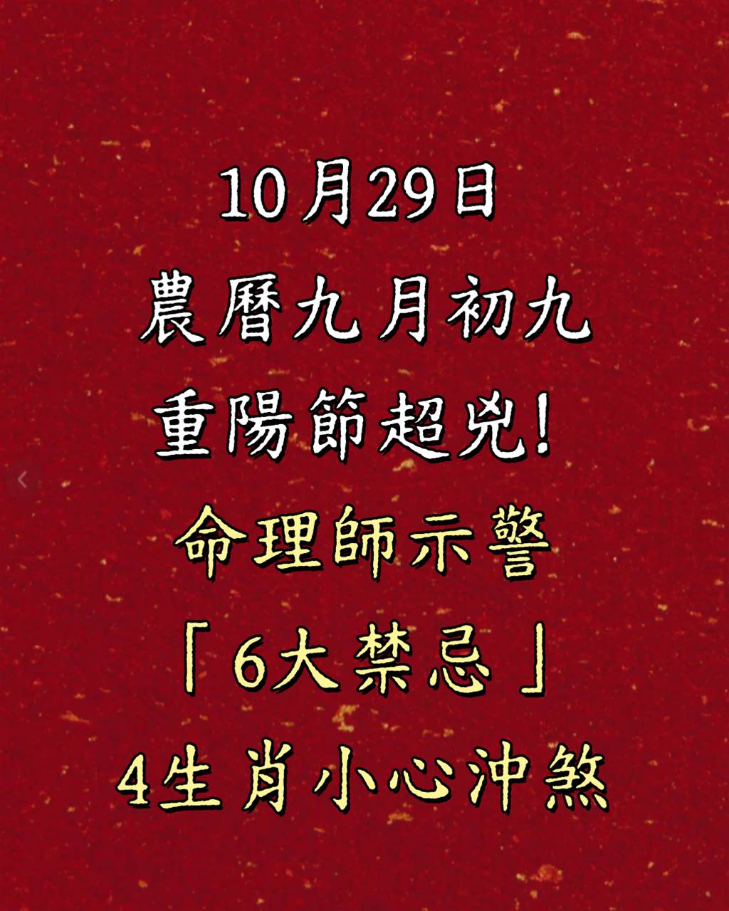 ⚠️ 重陽節超兇!命理師示警「6大禁忌」,4生肖小心沖煞,避開才有好運!