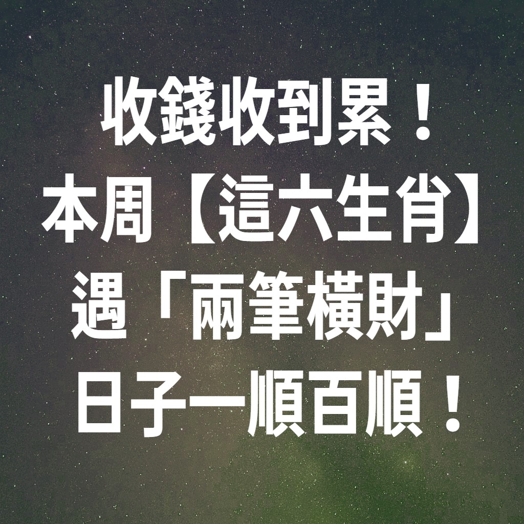 橫財二: 意外驚喜。運勢旺盛,本週若有去外地出差或旅遊,不妨順手買張彩券,也許會帶來意想不到的驚喜。