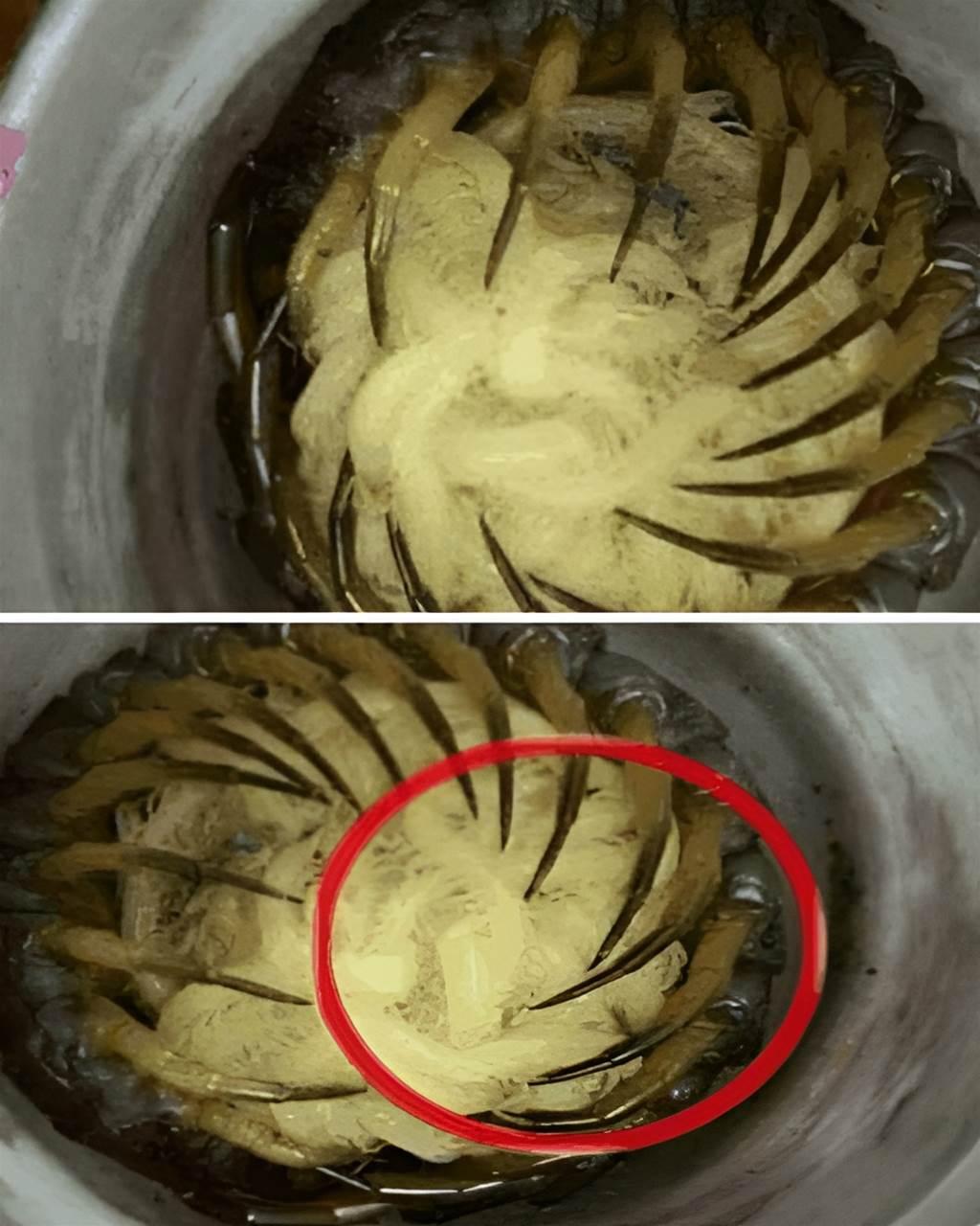 沒想到,真相曝光後,讓所有人都哭笑不得——原來那所謂的「帶爪子小球」,竟然是乾掉變質的防潮矽膠墊與油垢結塊後的產物!電子鍋底部有些型號會內附一層導熱矽膠圈,若長期未使用又遭油氣、灰塵與潮濕影響,表層會氧化、變硬,並因受熱變形而「翹起」成放射狀形狀,看起來就像長了腳的異物。