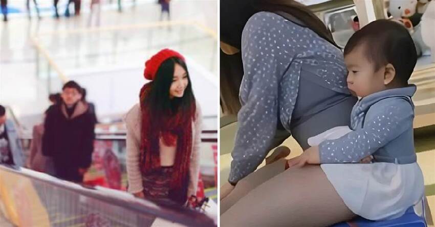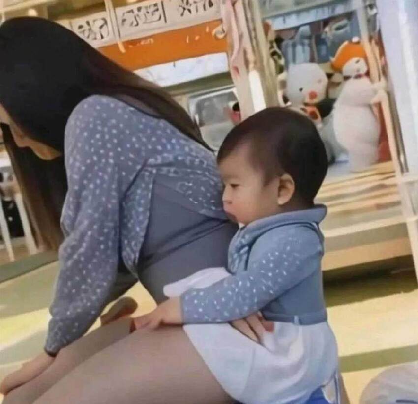 這位辣媽正在商場陪伴孩子玩耍,照片中孩子依偎在母親身上,或許正在小憩。