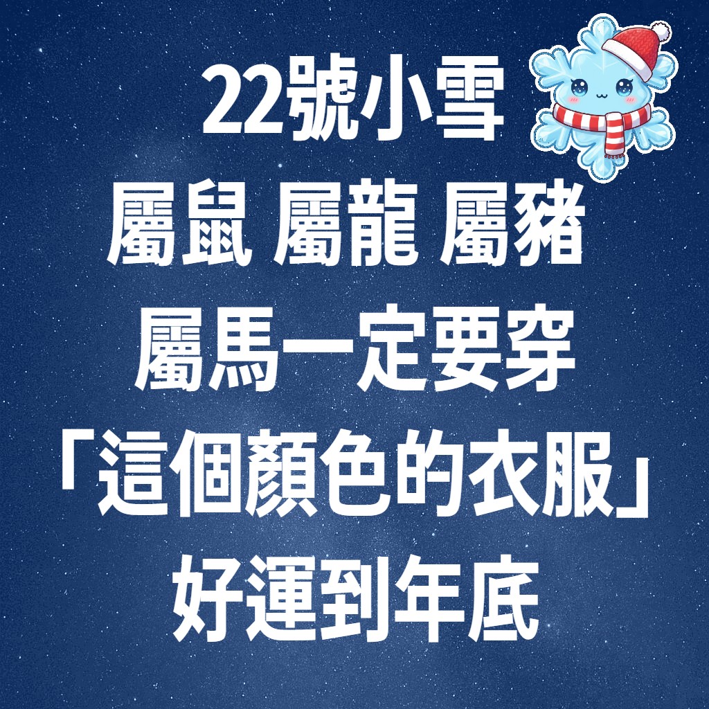 11 月 22 日是「小雪」節氣,日元為強勁的 土(己未日)。屬鼠(水)、屬龍(土)、屬豬(水)、屬馬(火)這四個生肖,需要一個能夠調和土氣、催生動力的顏色,才能確保好運一路順暢到年底。