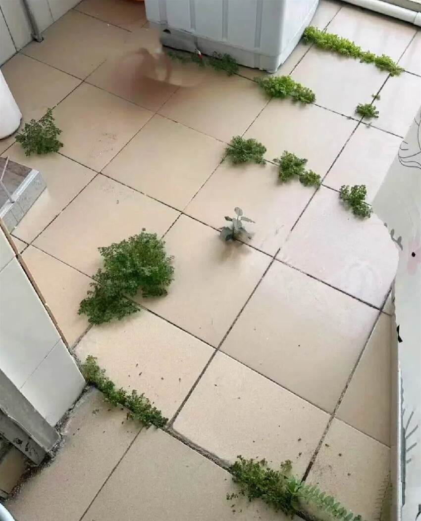 小林因為工作外派,兩個月沒回家,某天終於回到住處,本來還期待著能好好休息,沒想到才剛踏進陽台就愣住了——地板縫隙間竟然長出一簇簇青翠的小草!不但四處蔓延,甚至靠近洗衣機還出現「整片綠洲」,場面彷彿變成室內花園。