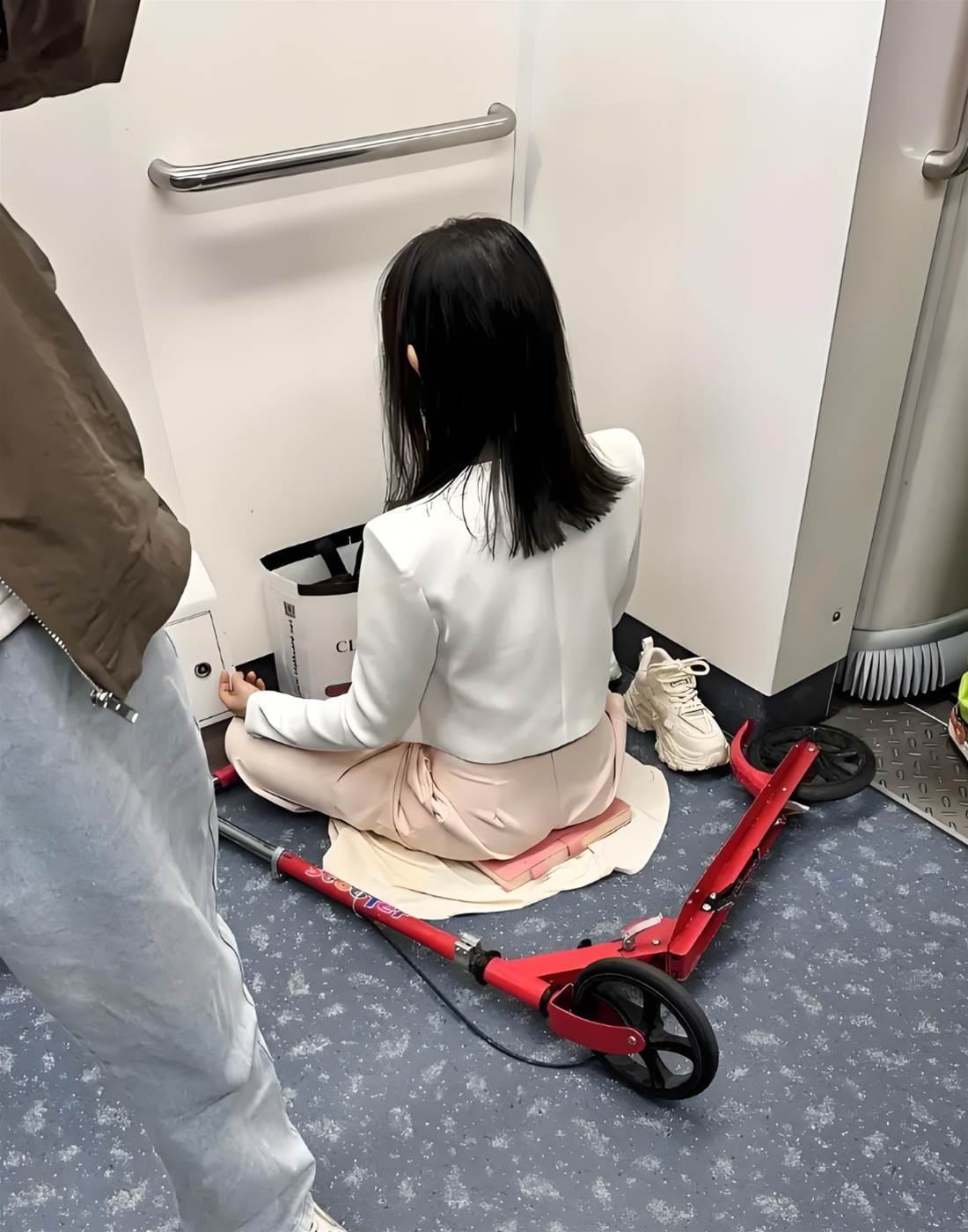 捷運上人潮湧動,一名年輕女孩卻突然成為全車焦點。只見她捨棄座位,直接坐在車廂角落的地板上,盤腿打坐,旁邊還放著滑板車與隨身物品。更讓乘客困惑的是,她屁股下竟墊著一塊特殊的坐墊,看起來不像一般的靠墊或衣物。