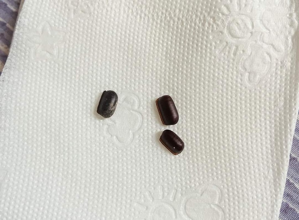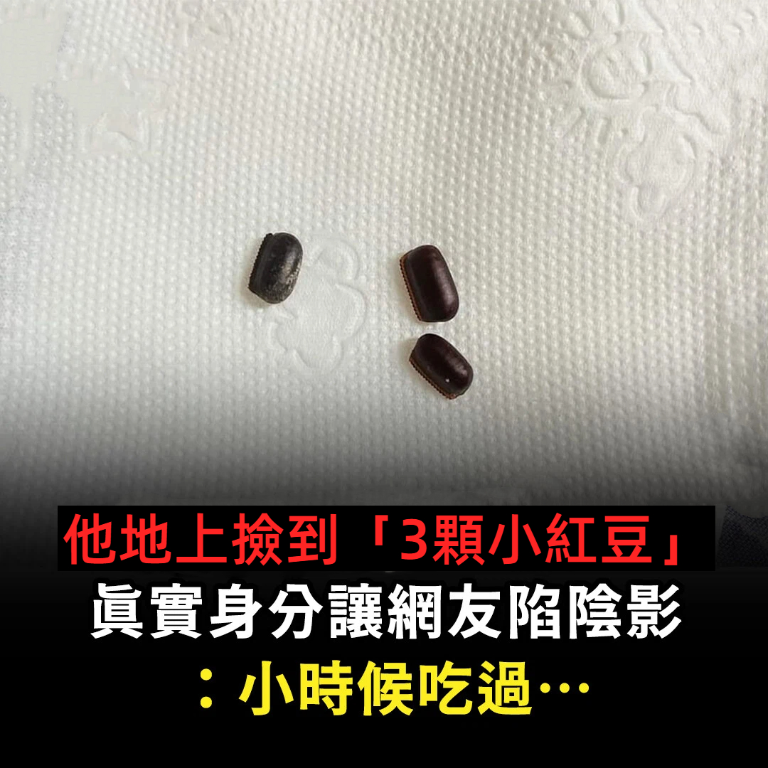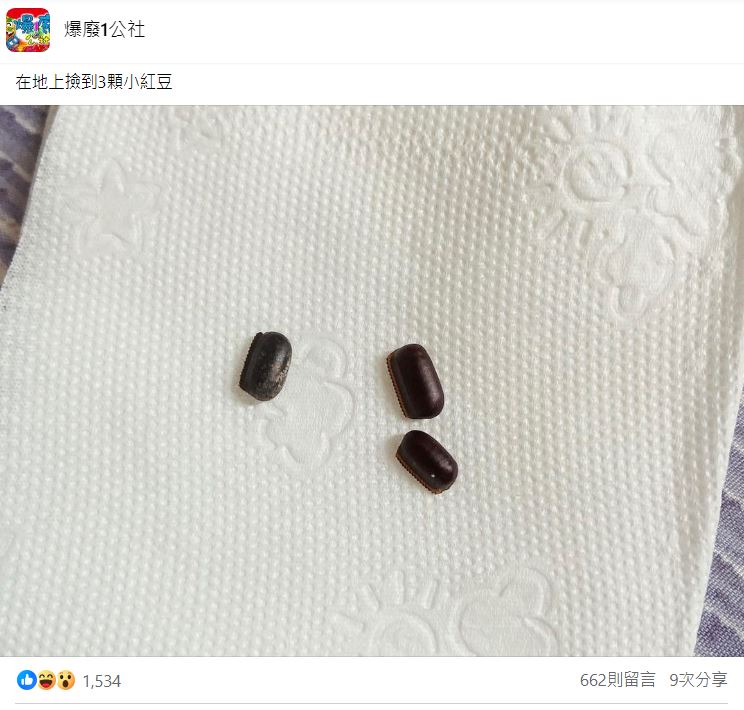 一位網友在臉書社團《爆廢1公社》淡定發文:「在地上撿到3顆小紅豆」,還附上照片。只見衛生紙上躺著三顆深紅、帶點光澤的小顆粒,遠看像紅豆,但仔細一瞧——邊緣呈鋸齒狀,也沒有紅豆中心那道白白的刻痕。
