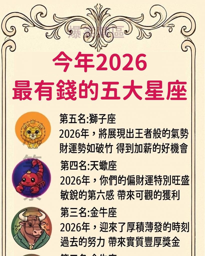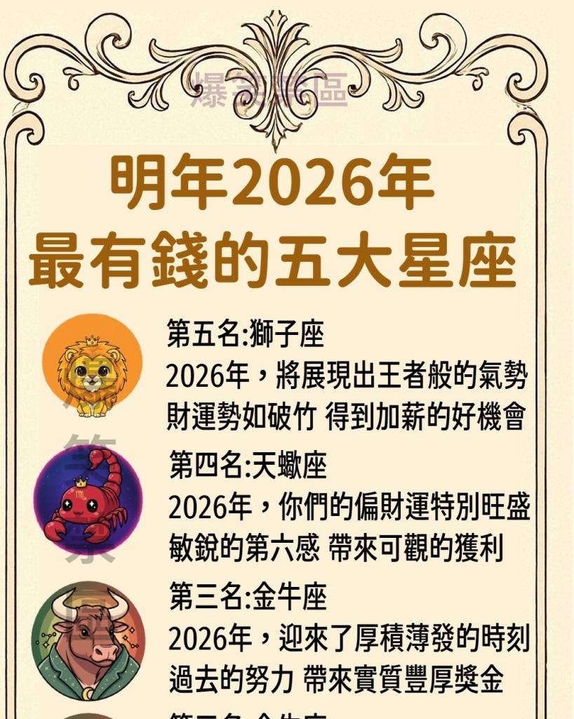 2026年,獅子座將展現出王者般的氣勢與魄力,財運勢如破竹。你們的領導才能將在事業上獲得極大肯定,不僅能得到升職加薪的好機會,甚至可能開創自己的事業,吸引大量資源與資金。你們的自信與魅力將成為最佳的吸金利器,各種合作機會與投資回報都將主動找上門。只要敢於行動,就能將財富牢牢掌握在自己手中。