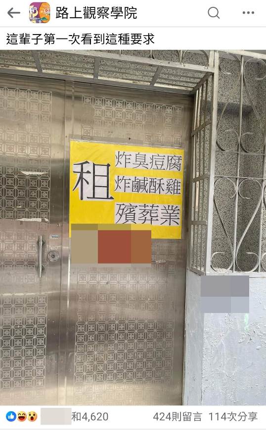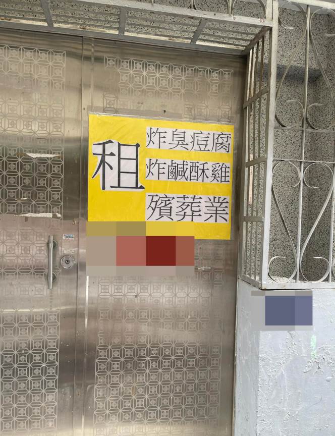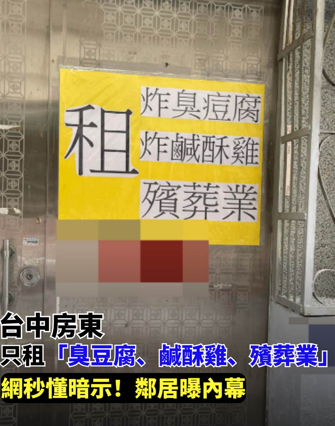 一位網友在臉書社團《路上觀察學院》分享,台中市一間民宅大門貼出公告,大大一個「租」字旁邊歡迎3種行業:炸臭豆腐、炸鹹酥雞、殯葬業。炸物攤和殯葬業平時不容易租到店面,這位房東卻只想租這3行業,原PO看愣:「這輩子第一次看到這種要求。」連房仲看到也很驚訝,因為這些條件通常會優先被篩掉。