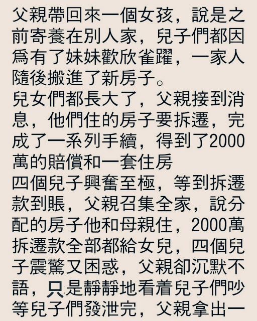 父親遞出了一張紙。四個兒子看到紙上的內容,心中的激動瞬間消失無蹤。原來他們才是可笑的小醜,在爭搶本就不屬於自己的東西。他們望着妹妹,眼神復雜,充滿了愧疚。回想起對妹妹說的那些話,兄妹感情深厚,沒想到因為錢,親情瞬間變得微不足道。父親隨後也向女兒說明了來龍去脈。女兒聽後沒有大哭大鬧,也沒有質問親生父母為何拋棄她她覺得養父養母對她關懷入微,至於自己的身世,並不重要。看到女兒如此堅毅豁達,父親一直懸着的心終於落了地。女兒當即表示要給每位哥哥300萬,給父母300萬,自己留下500萬。這讓所有人卻大為吃驚,包括她的四個哥哥和父親。父親趕忙推辭,說這是她親生父親留給她的財產,可女兒表示錢再多也比不上家人的重要。她愛他們每一個人。親情永遠是無價的,我們永遠都是親密無間、相親相愛的一家人。